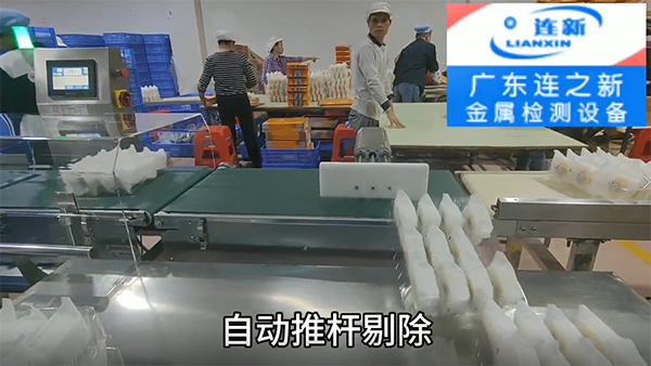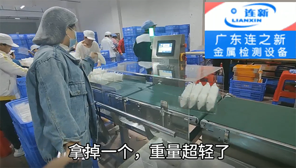 廣東連之新自動重量選別機現場使用圖片,重量超輕或超重都能自動選擇剔除。